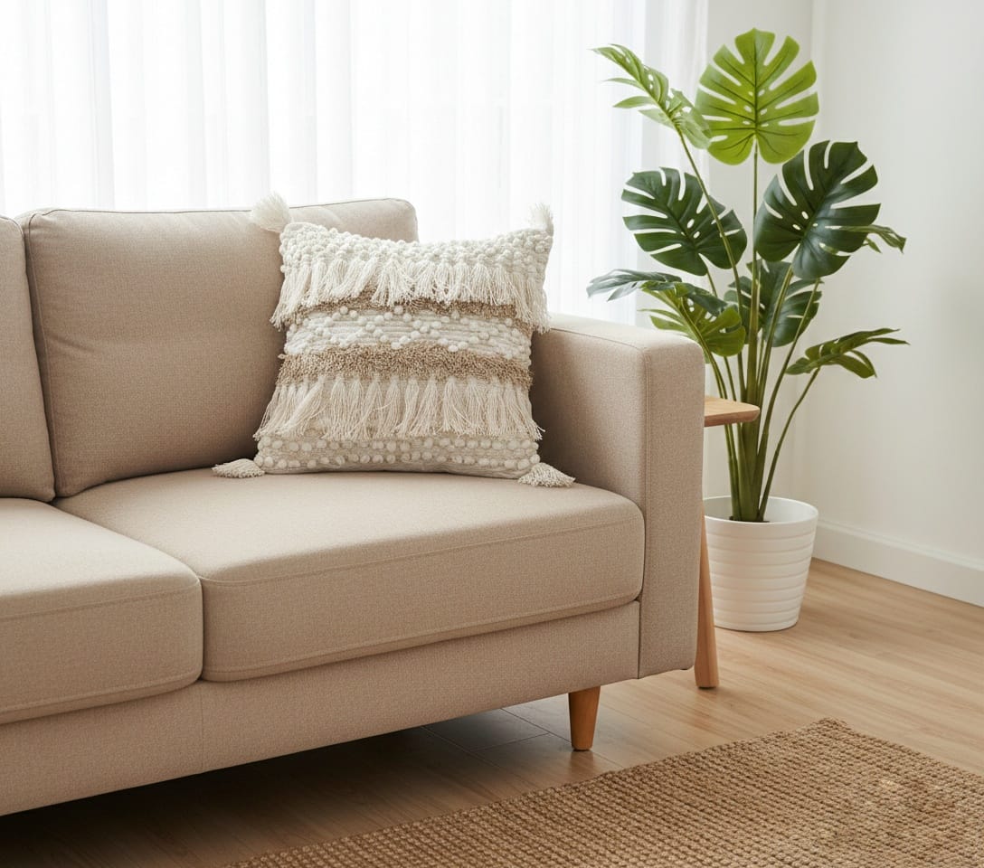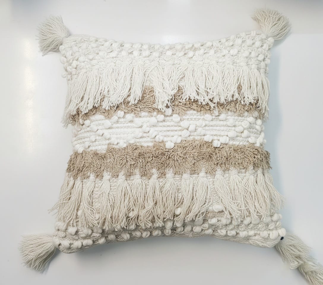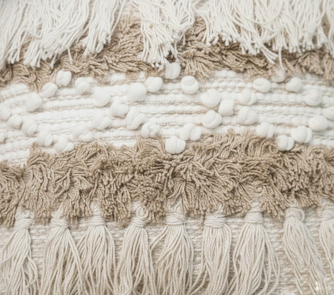 Add a cozy boho touch to your space with this Ivory & Beige Textured Cushion Cover. Featuring layered woven textures, tassels, and pom-pom detailing, it brings warmth and handcrafted charm to sofas, beds, and lounge areas.