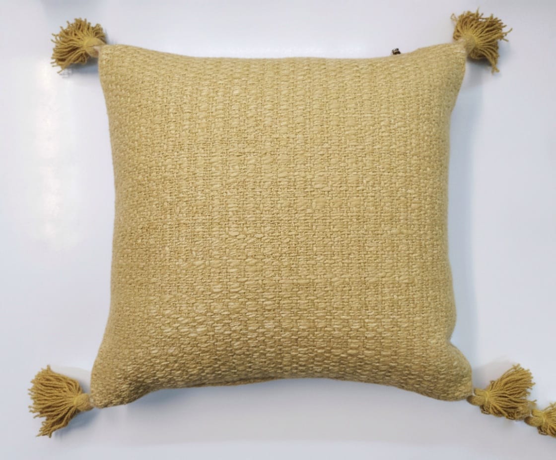 Bring subtle elegance to your décor with this Solid Mustard Textured Cushion Cover. Crafted from premium woven fabric and finished with tassels at the corners, it adds warmth and a refined touch to sofas, beds, and lounge spaces. Perfect for modern, minimal, and boho interiors.