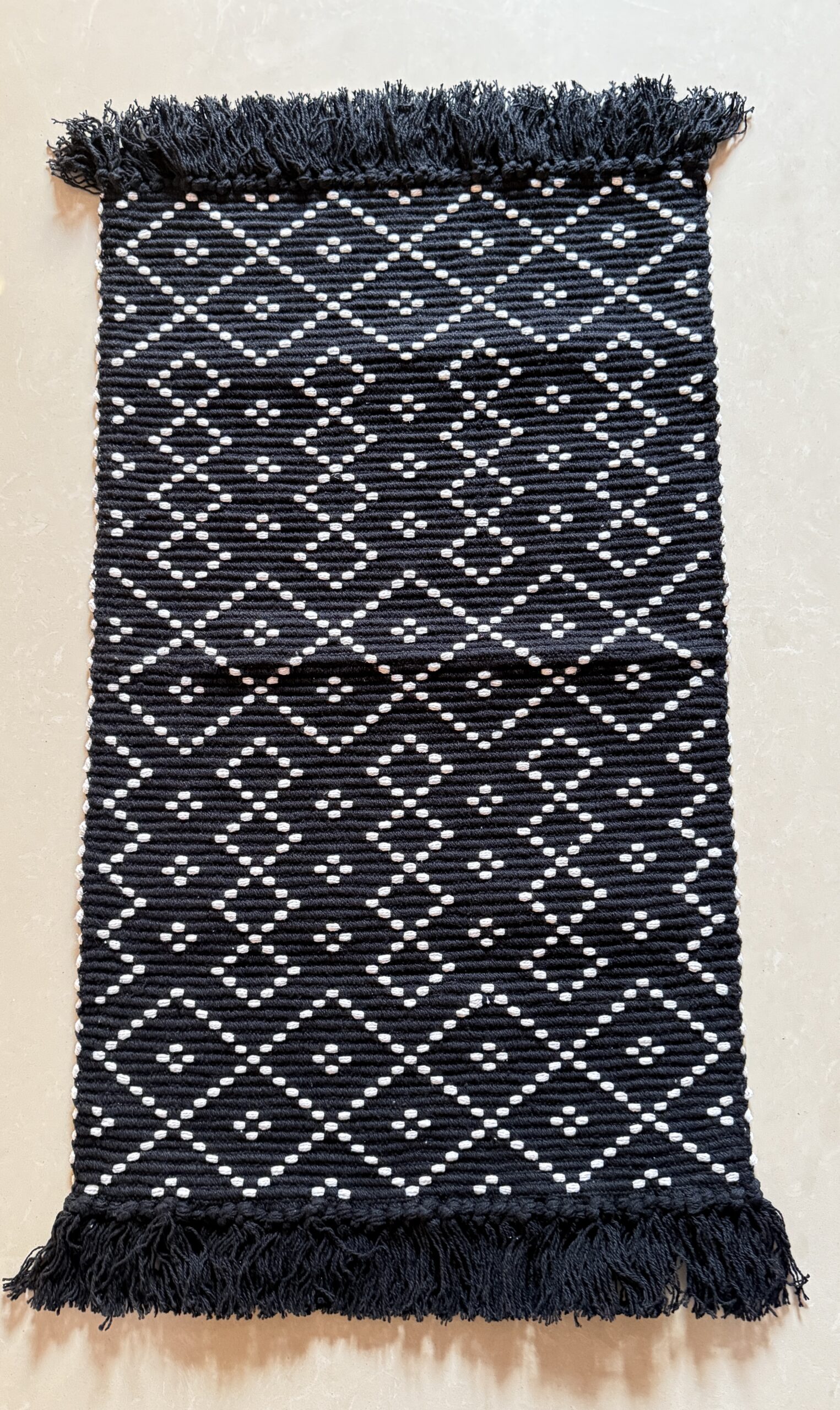 Featuring a pure cotton thread work black and white geometrical pattern rug 28 x 18 inches . Elevate your home decor with dihikas collection of small rugs, thoughtfully designed to add charm and comfort to your living room or bedroom.
