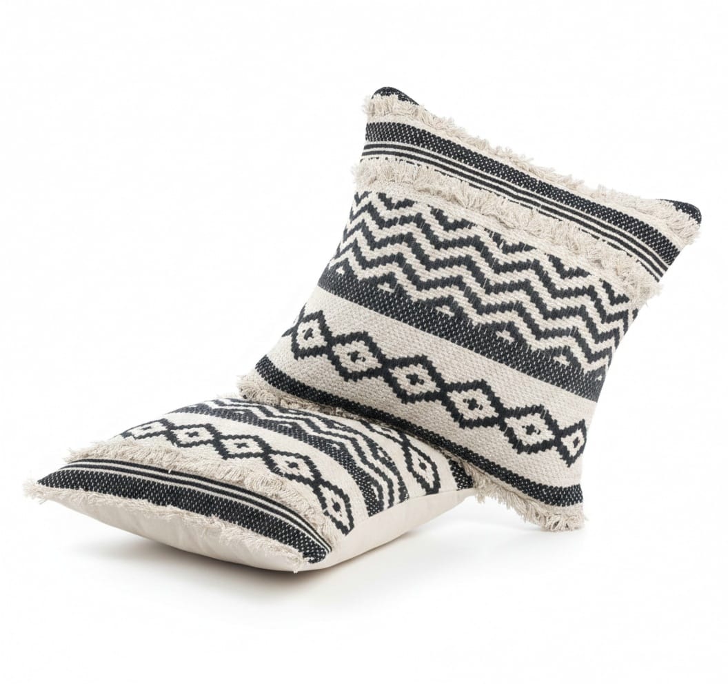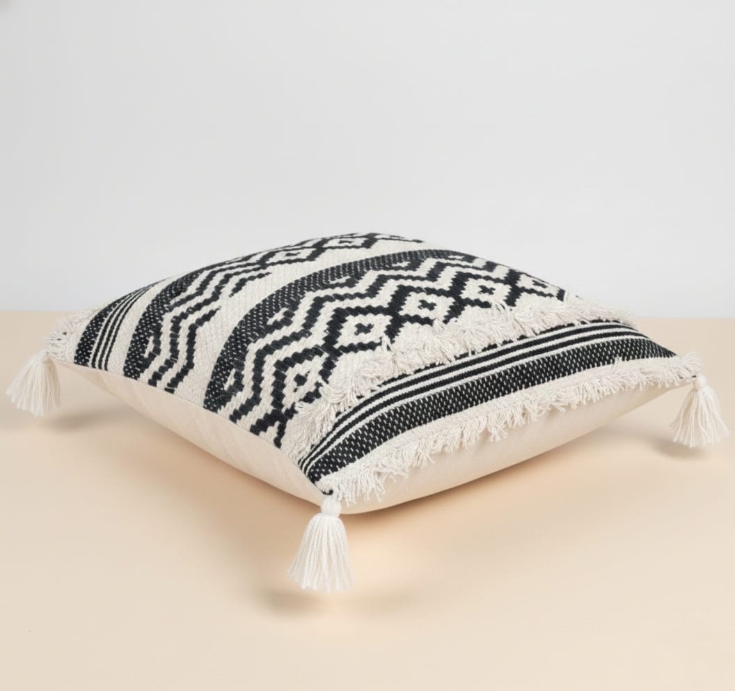 Black & White Geometric Cotton Cushion Cover with a textured handwoven design featuring diamond and chevron patterns. Made from soft, durable cotton with neutral tones and fringed edges—perfect for sofas, beds, or accent chairs.