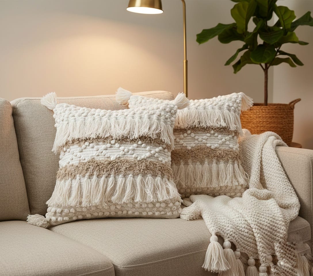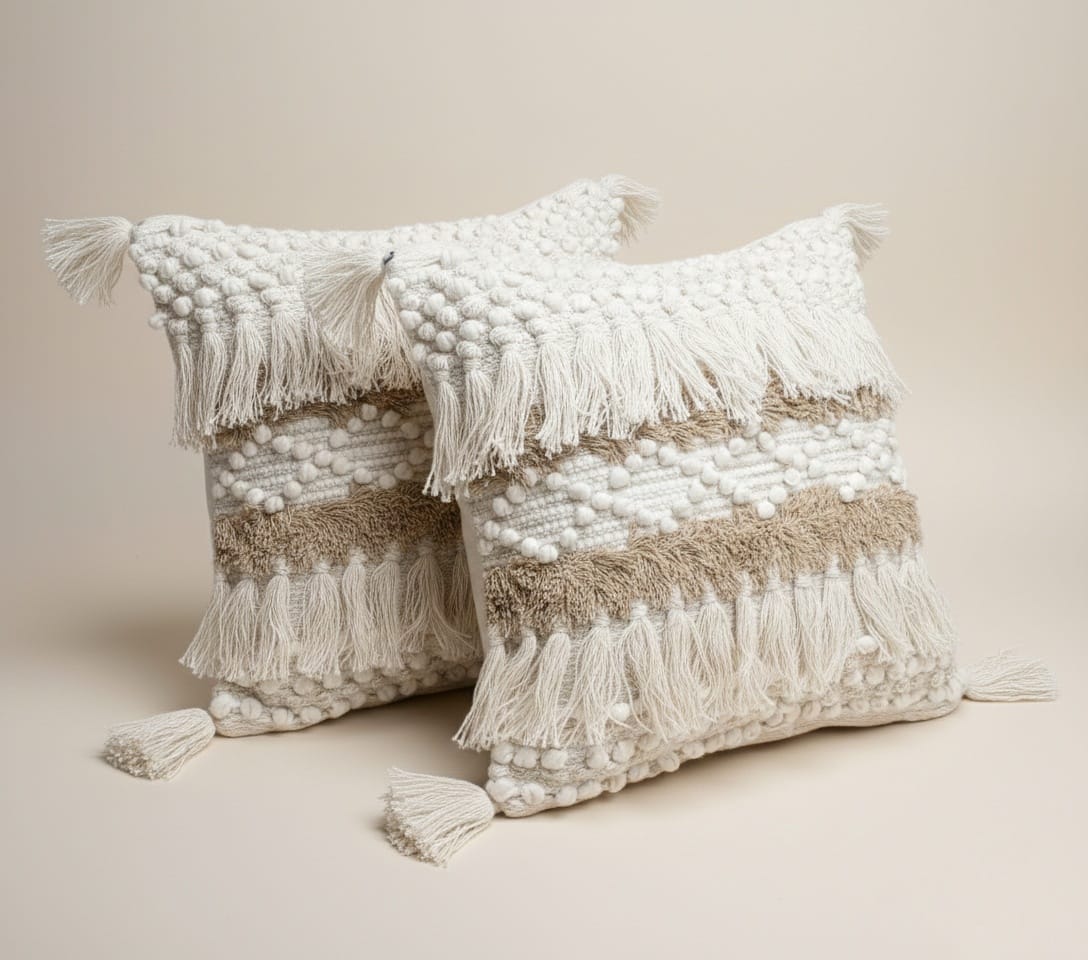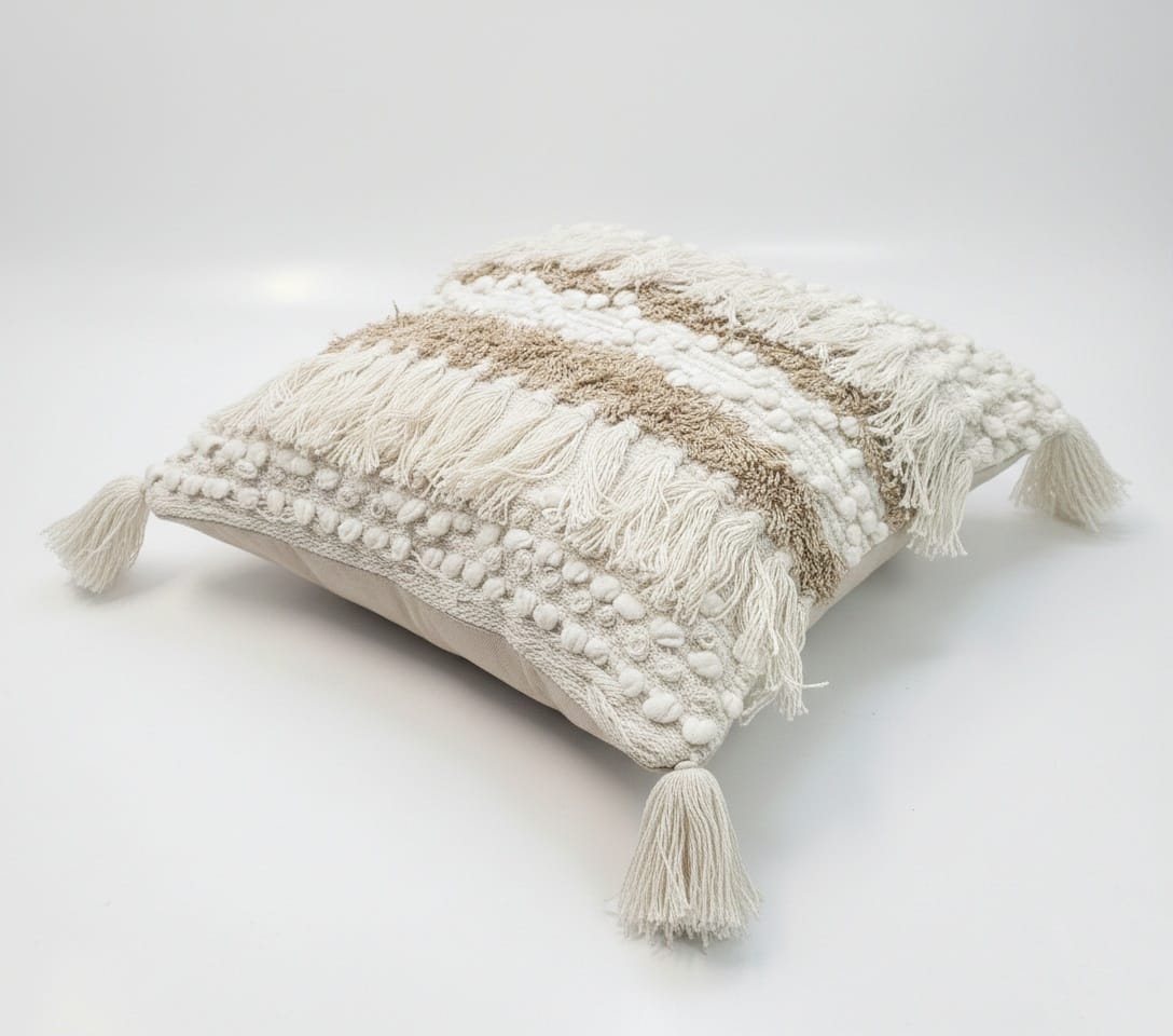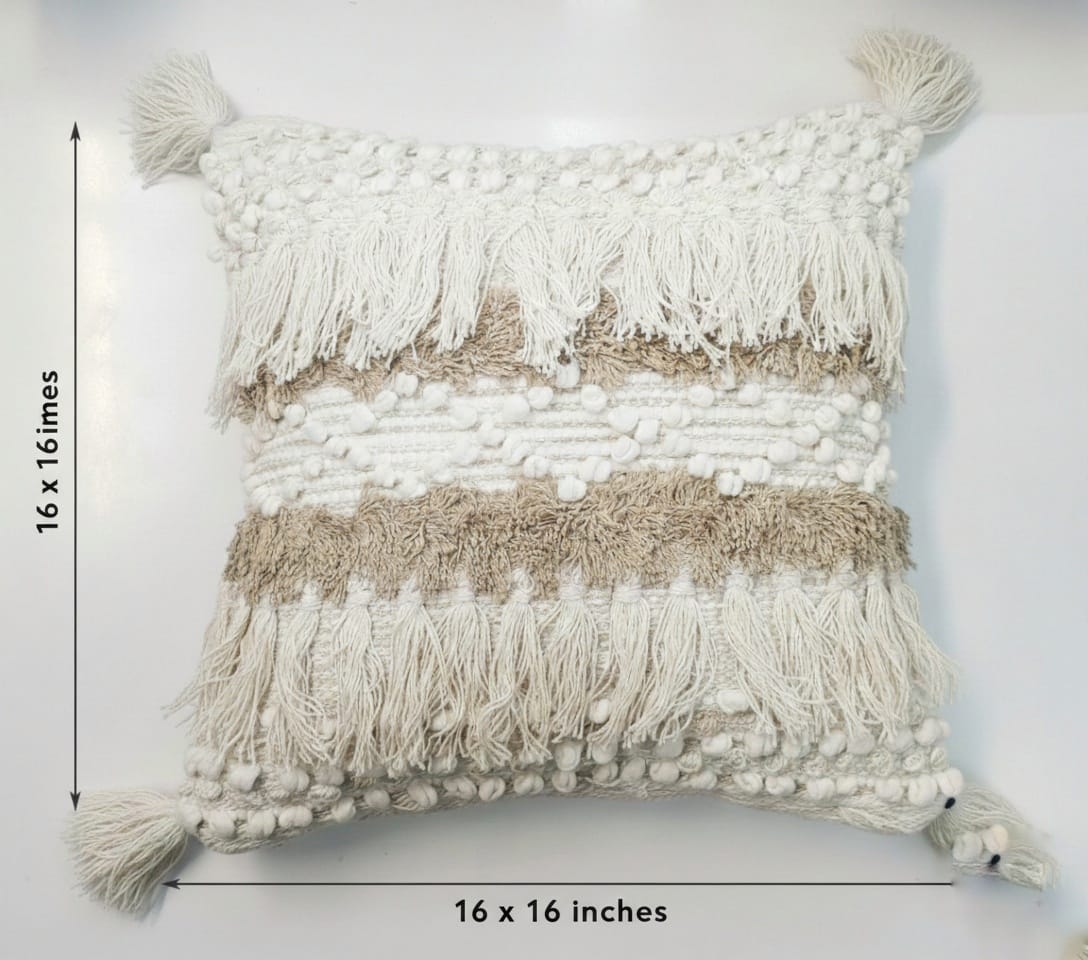 Add a cozy boho touch to your space with this Ivory & Beige Textured Cushion Cover. Featuring layered woven textures, tassels, and pom-pom detailing, it brings warmth and handcrafted charm to sofas, beds, and lounge areas.