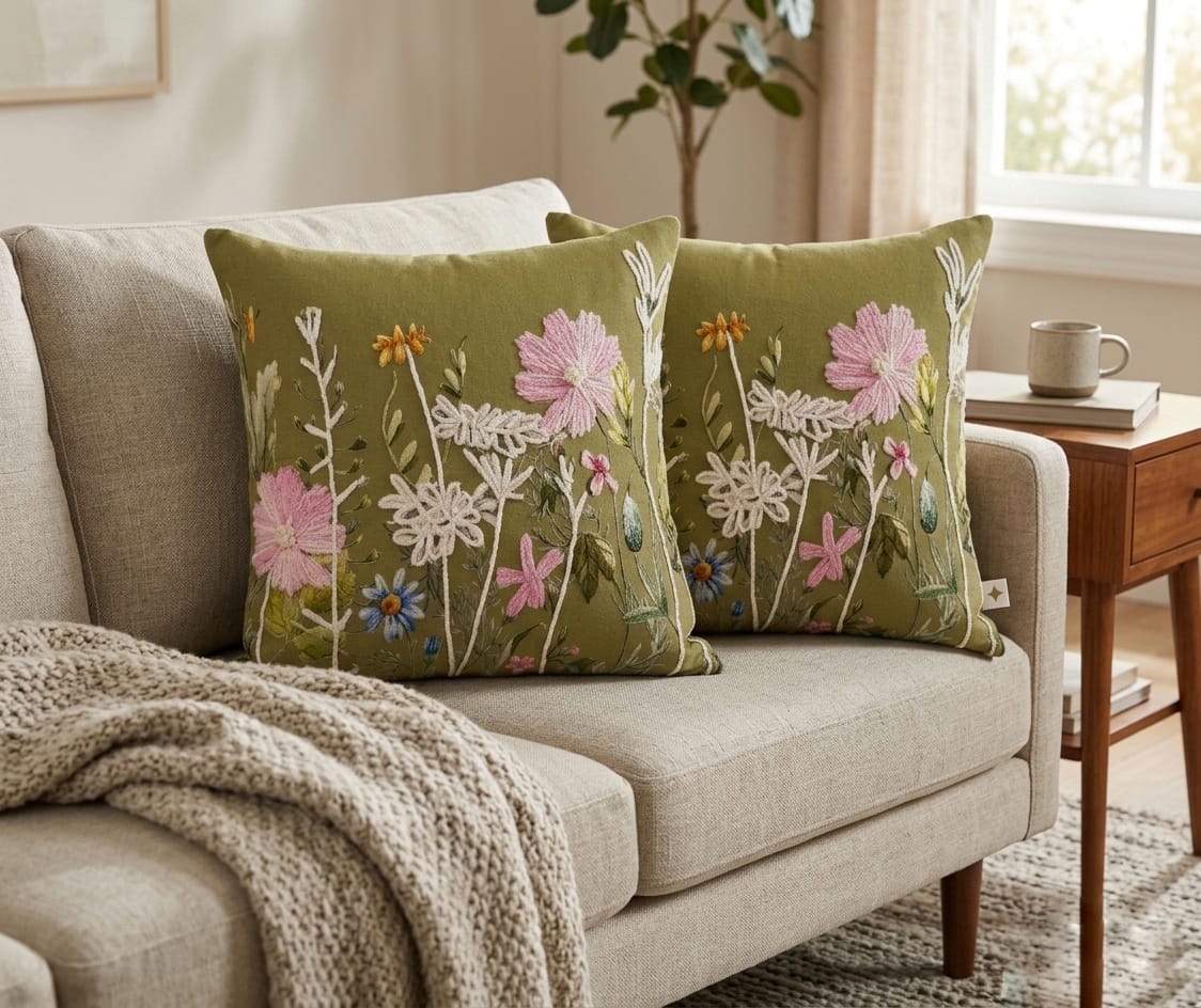 Add a natural and calming touch to your décor with this beautifully embroidered cushion cover featuring delicate meadow-inspired floral patterns on an olive-green base. The soft textured embroidery and subtle pastel accents make it a perfect decorative piece for sofas, beds, or cozy corners.