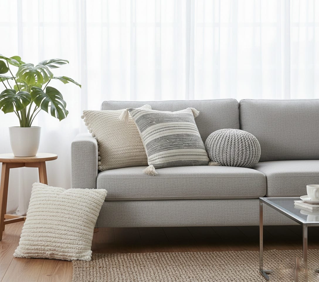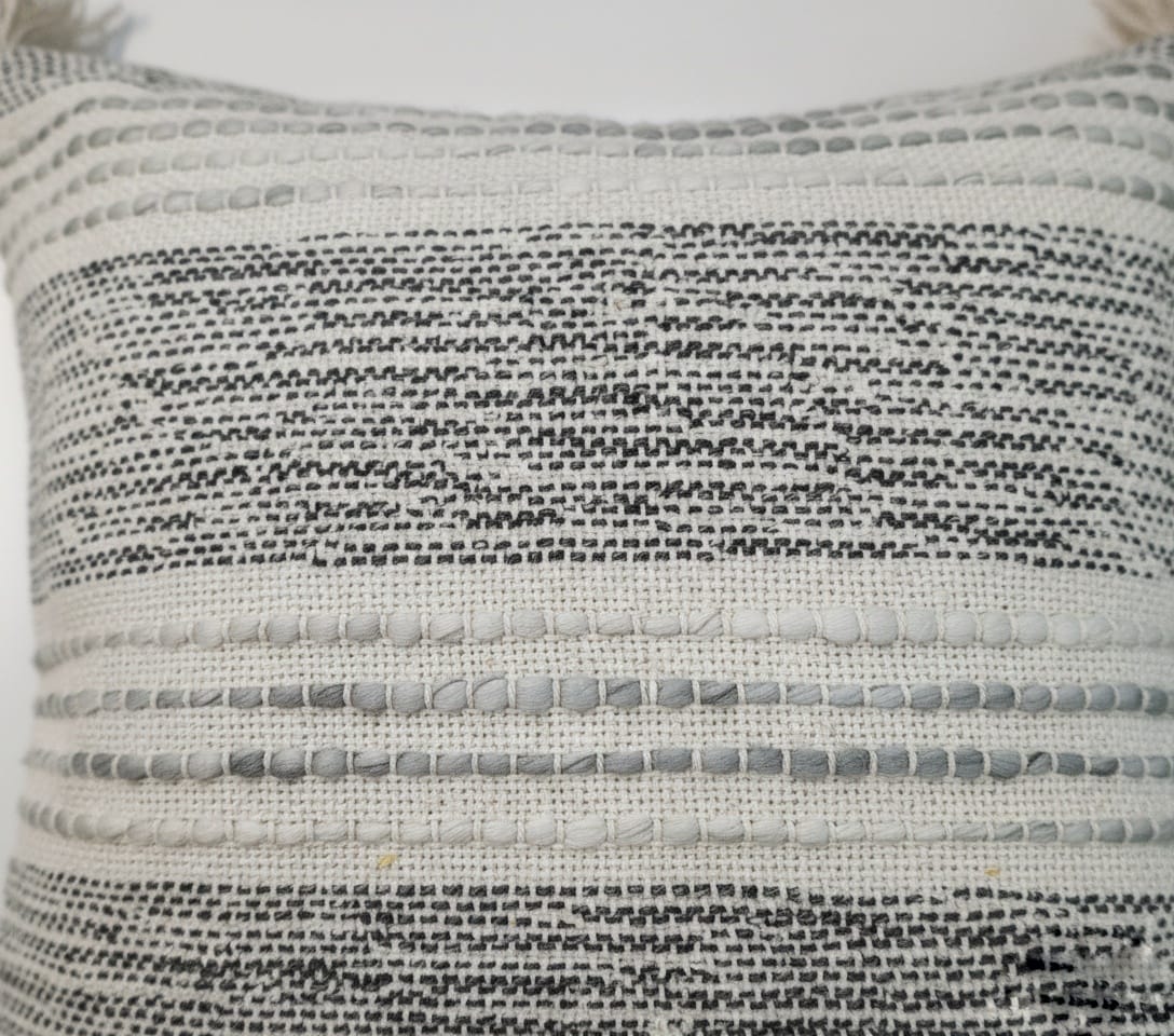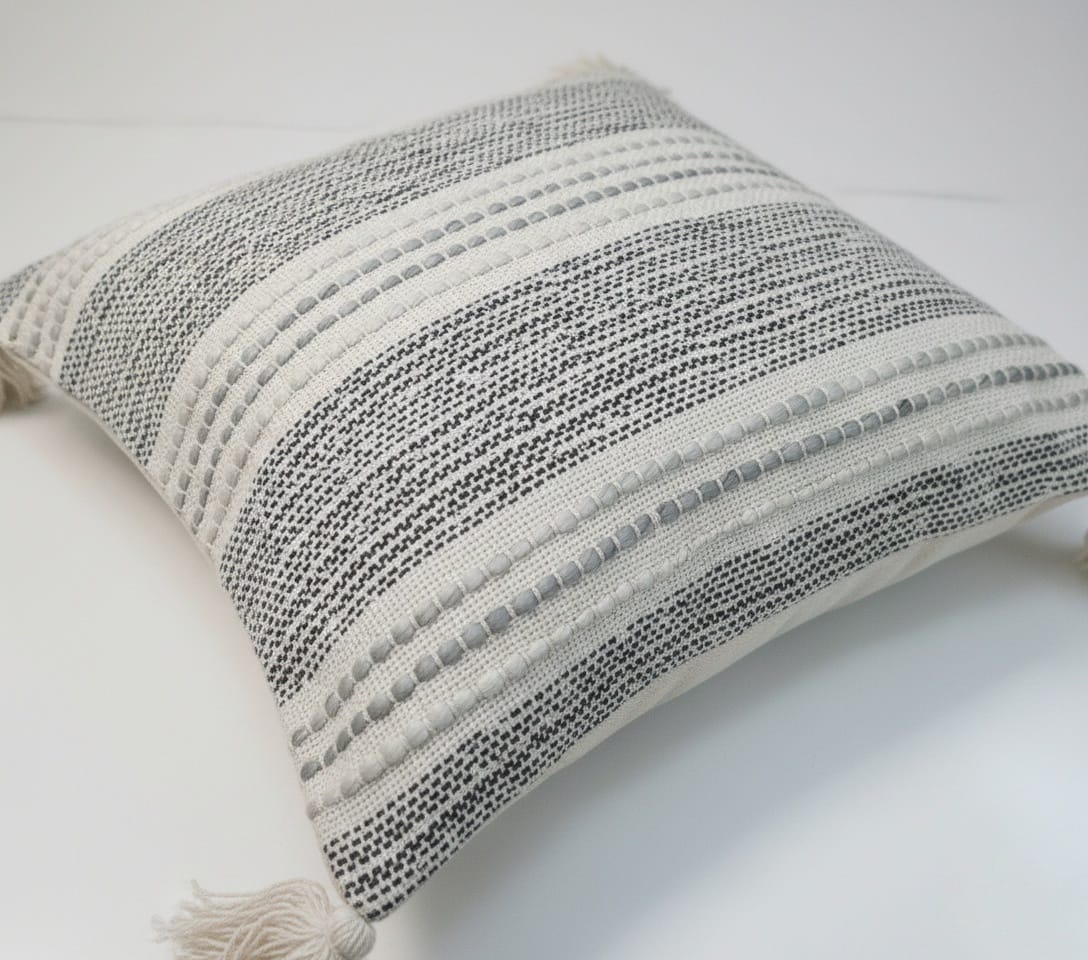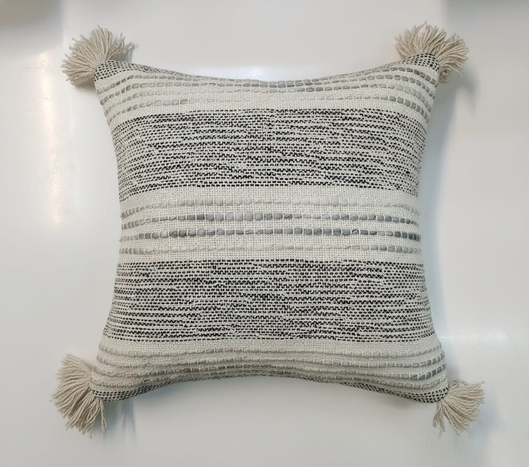 Add a soft, modern touch to your space with this ivory textured cushion cover. Designed with subtle woven patterns and finished with tassels on all four corners, it blends effortlessly with boho, minimal, and contemporary interiors. Perfect for sofas, beds, or accent chairs.